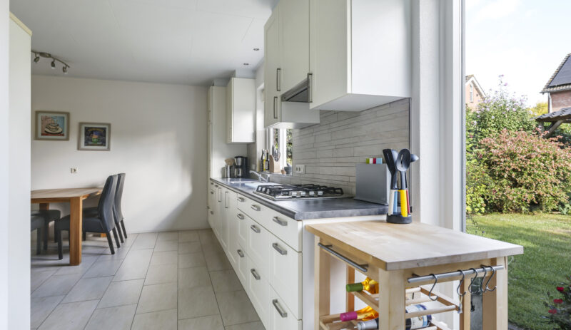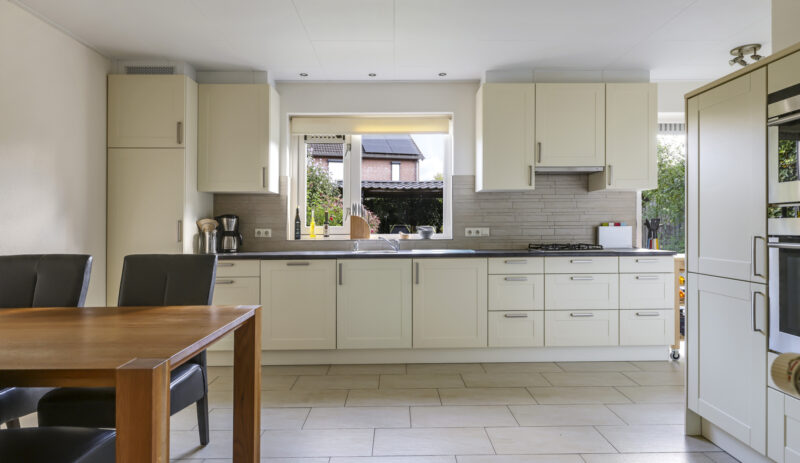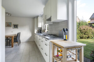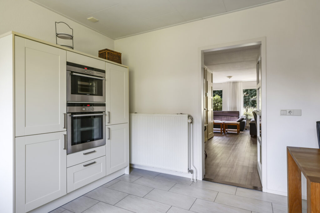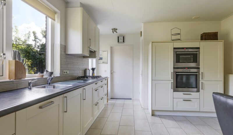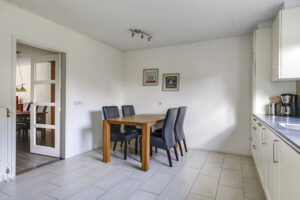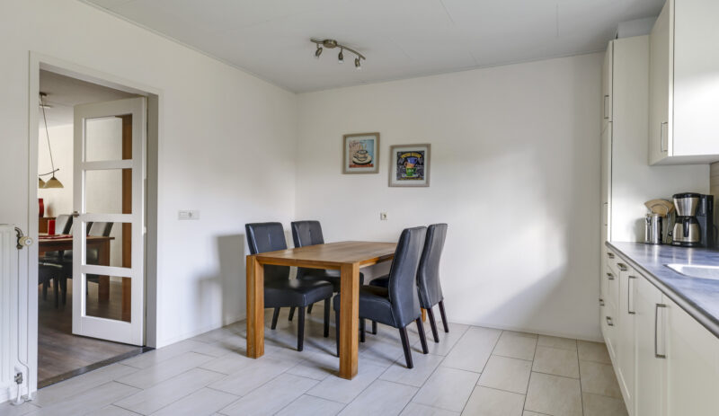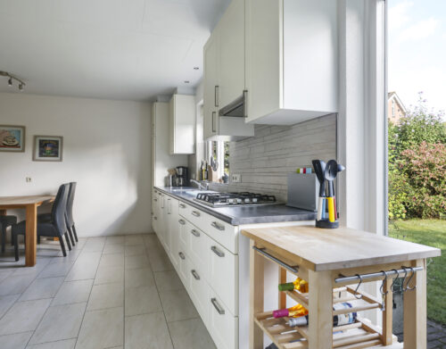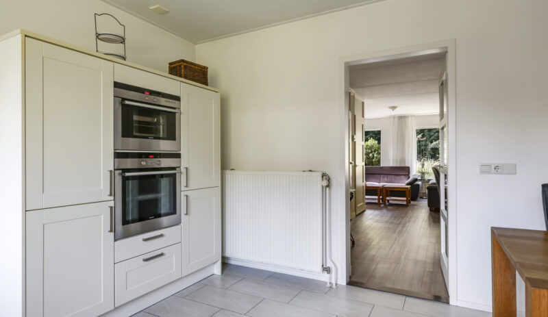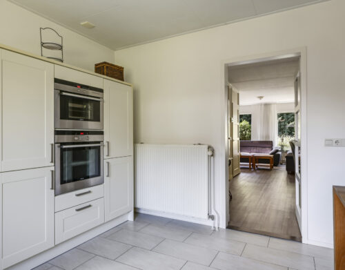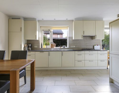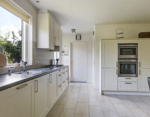 De woning werd in 1995 aan de achterzijde uitgebouwd. Hier vind je nu de gezellige woonkeuken, die direct uitnodigt tot lange tafelsessies en borrelavonden. De nette inbouwkeuken is voorzien van diverse apparatuur, waaronder een koelkast, vaatwasser, gaskookplaat, afzuiging, oven én een stoomoven. Dankzij de kasten en laden is er bovendien volop opbergruimte.