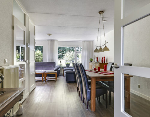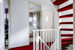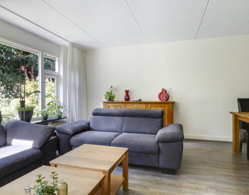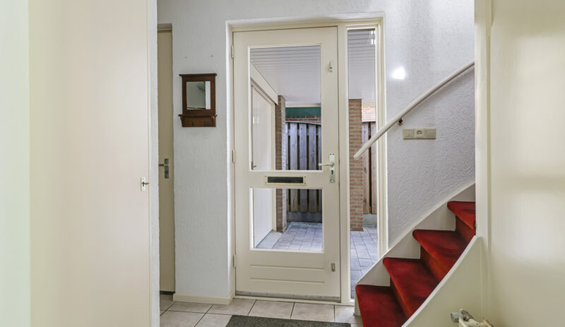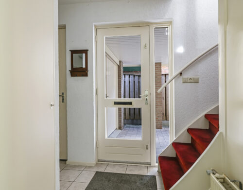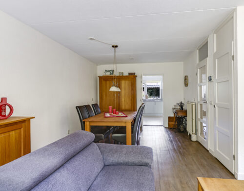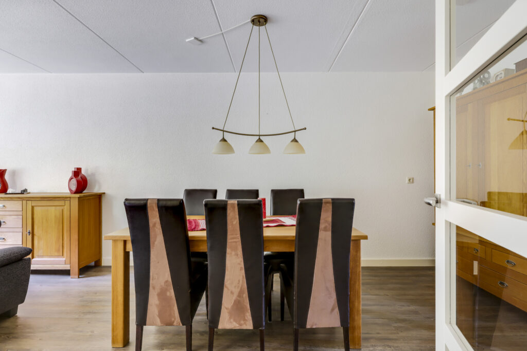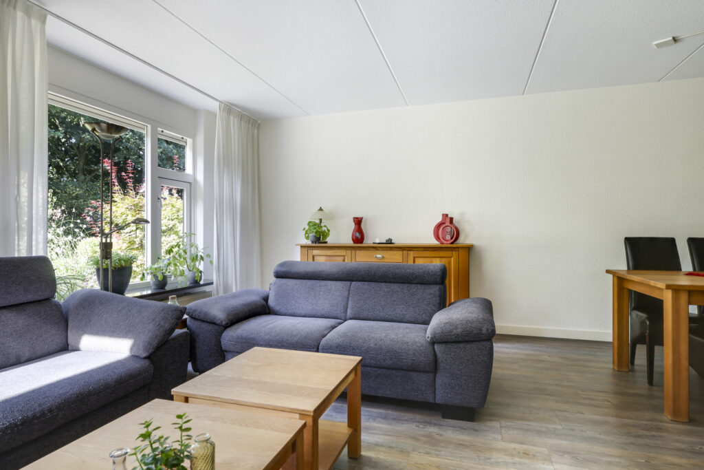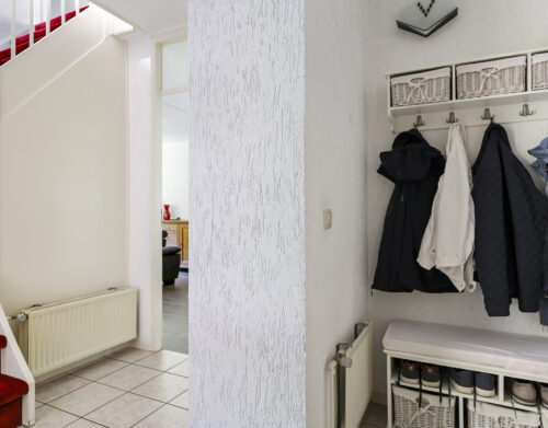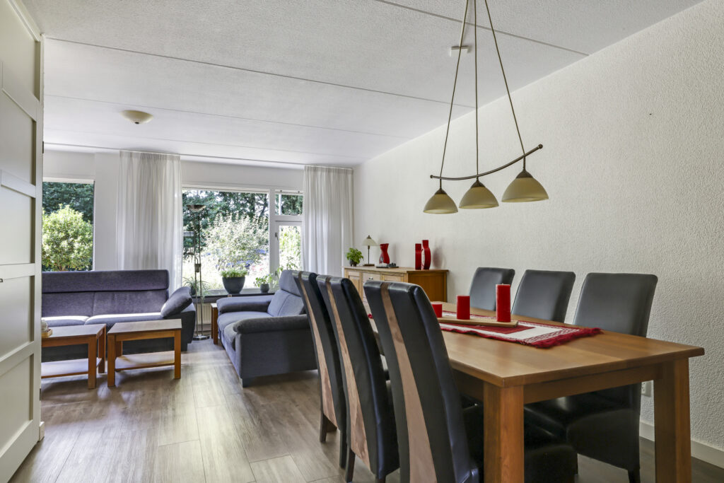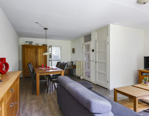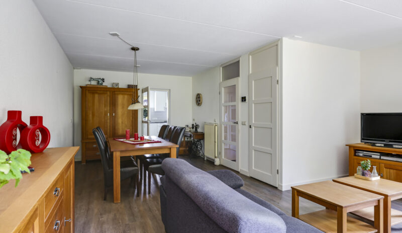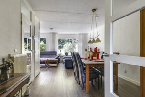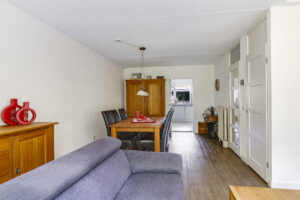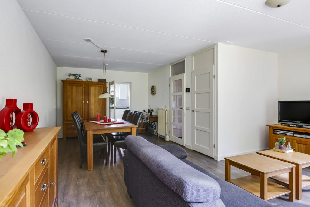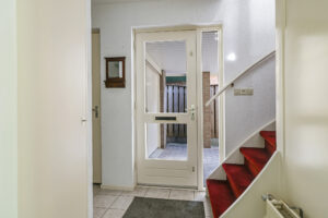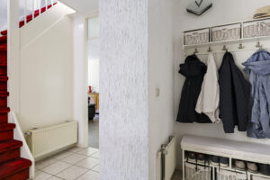 Bij binnenkomst stap je de hal in, vanwaar je doorloopt naar de lichte, L-vormige woonkamer. De grote ramen zorgen voor een prettige lichtinval en de PVC-vloer geeft het geheel een verzorgde uitstraling. Onder de trap bevindt zich een handige provisiekast – ideaal voor de voorraad of de stofzuiger.