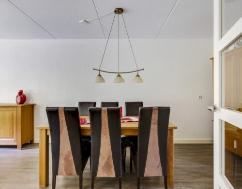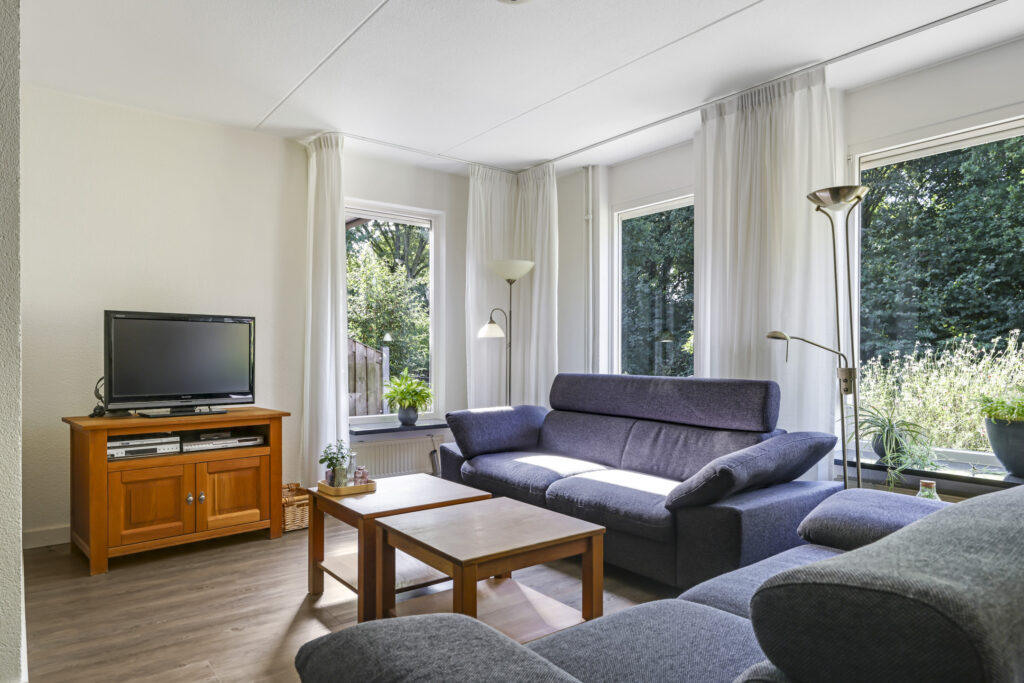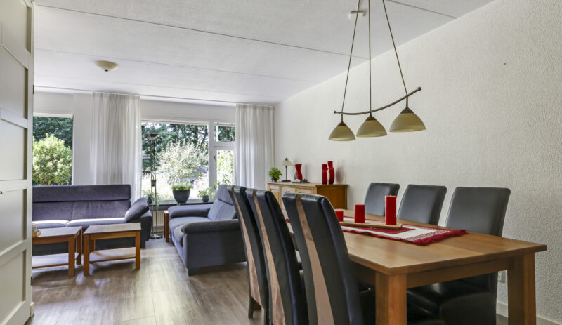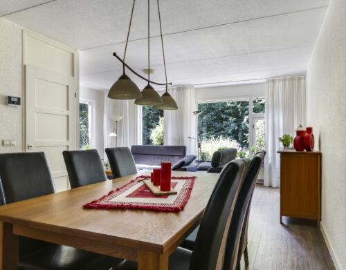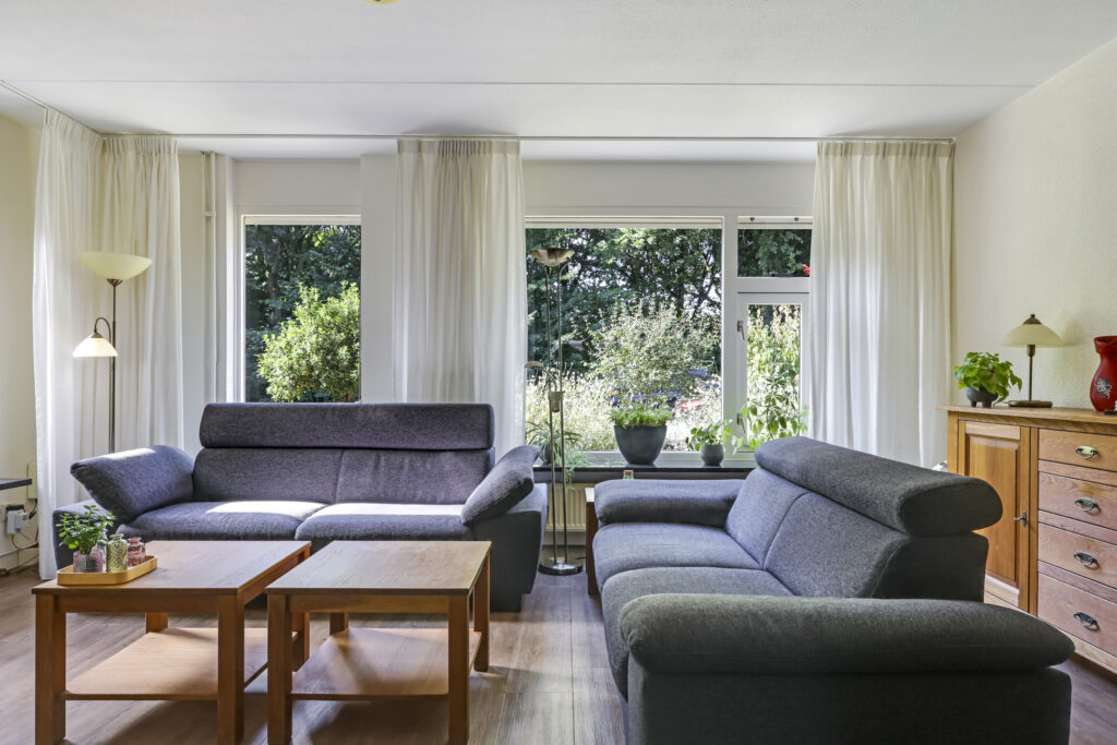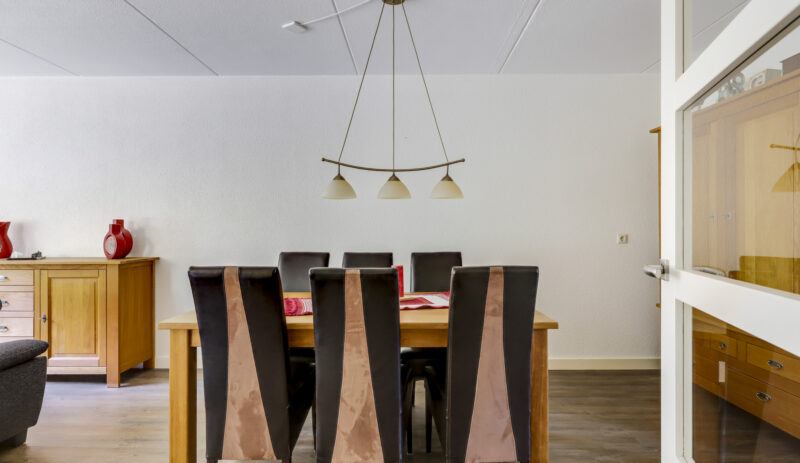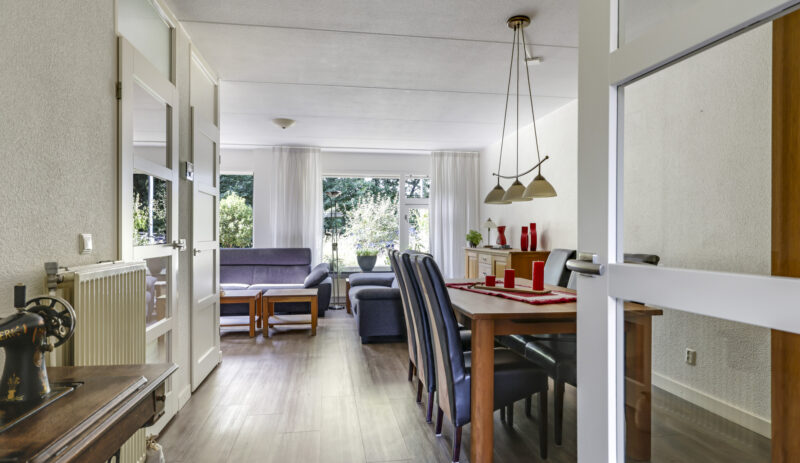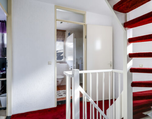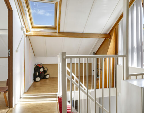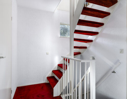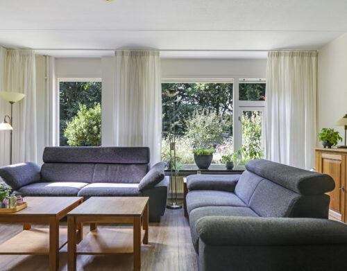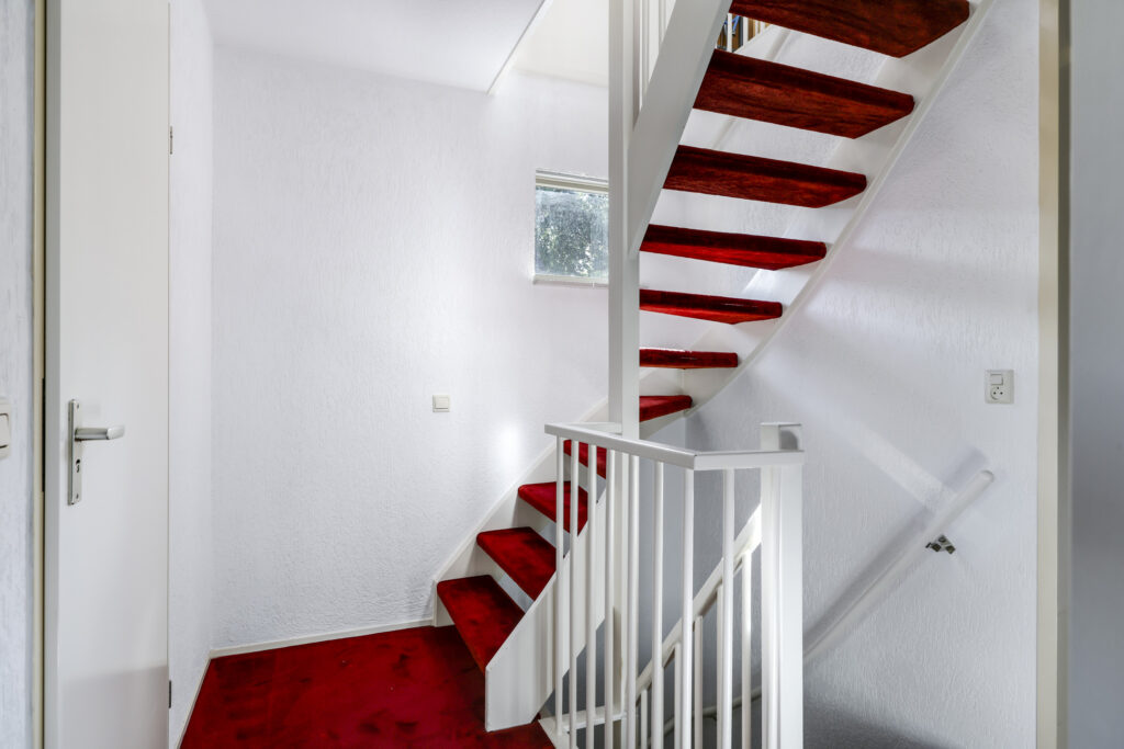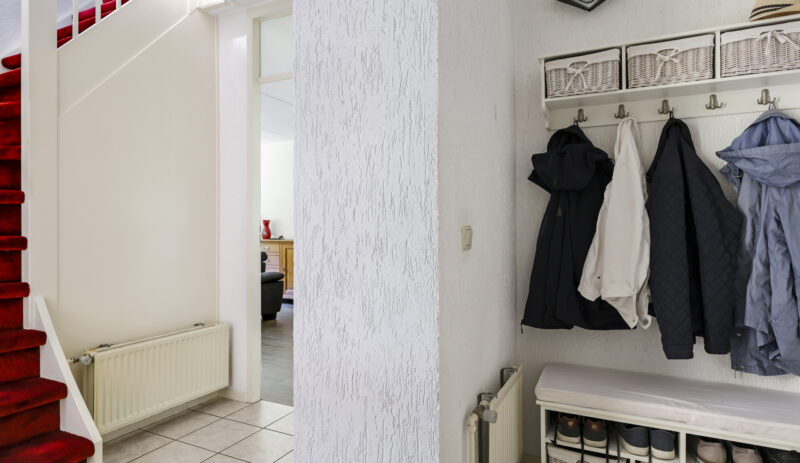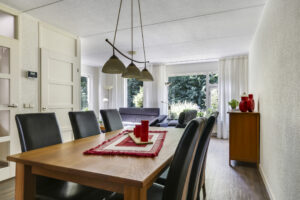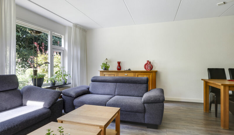 Bij binnenkomst stap je de hal in, vanwaar je doorloopt naar de lichte, L-vormige woonkamer. De grote ramen zorgen voor een prettige lichtinval en de PVC-vloer geeft het geheel een verzorgde uitstraling. Onder de trap bevindt zich een handige provisiekast – ideaal voor de voorraad of de stofzuiger.