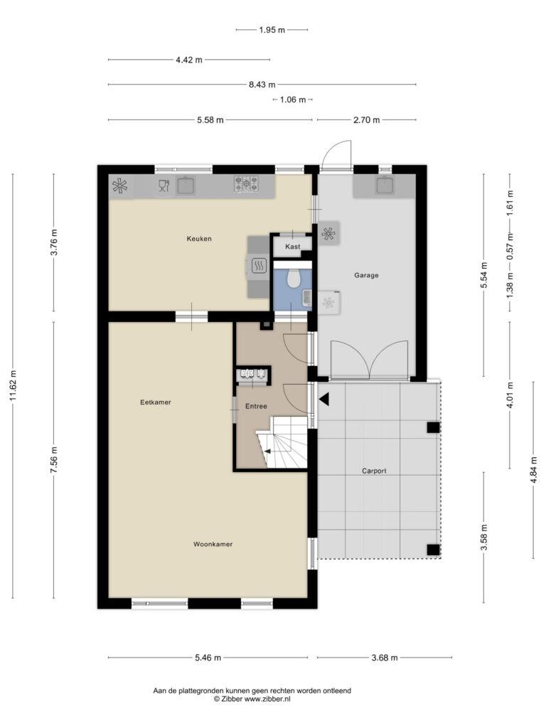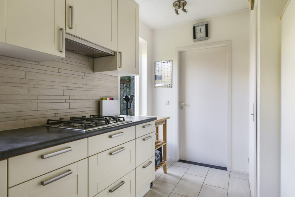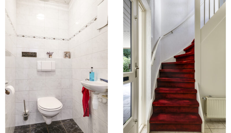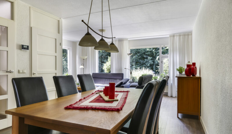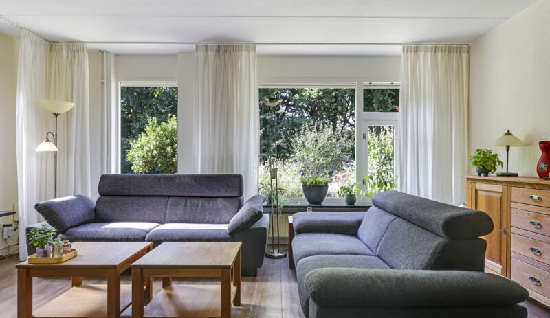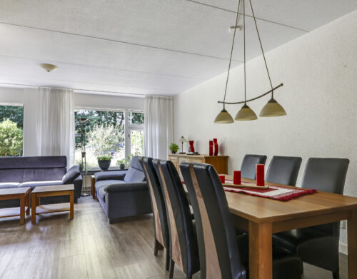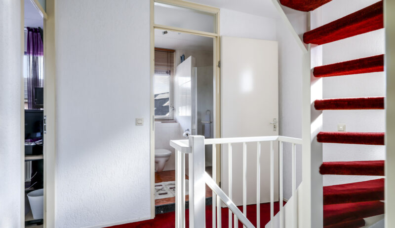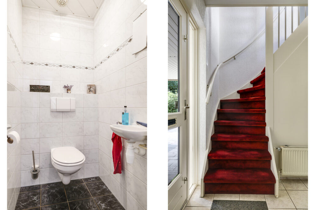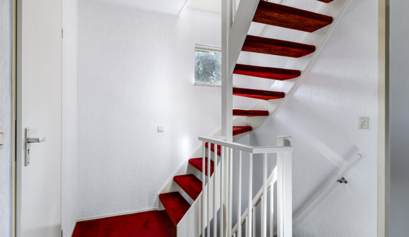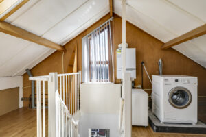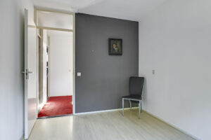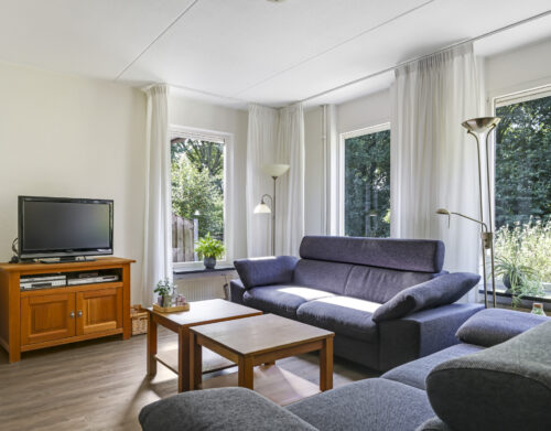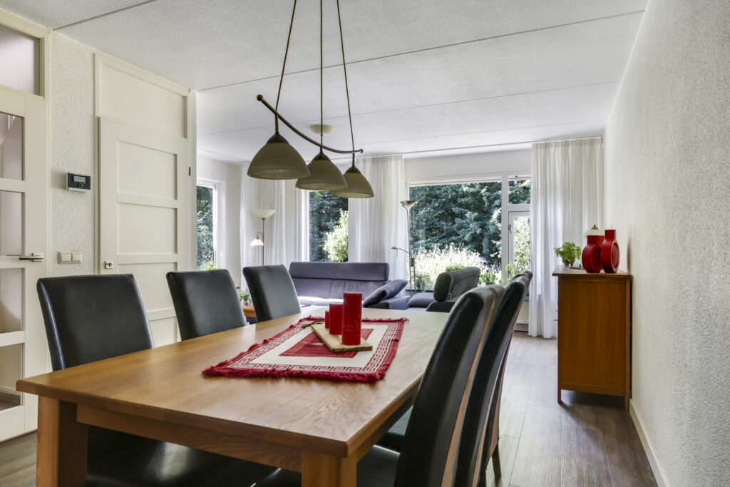 Bij binnenkomst stap je de hal in, vanwaar je doorloopt naar de lichte, L-vormige woonkamer. De grote ramen zorgen voor een prettige lichtinval en de PVC-vloer geeft het geheel een verzorgde uitstraling. Onder de trap bevindt zich een handige provisiekast – ideaal voor de voorraad of de stofzuiger.