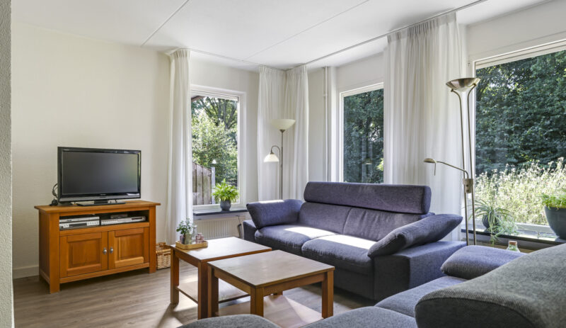 Aan de voorzijde van de woning zijn screens geplaatst, wat extra comfort biedt op zonnige dagen.