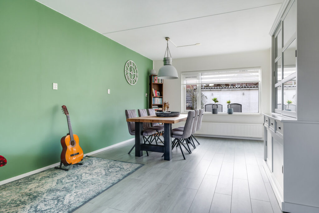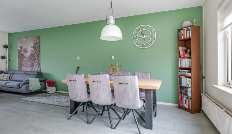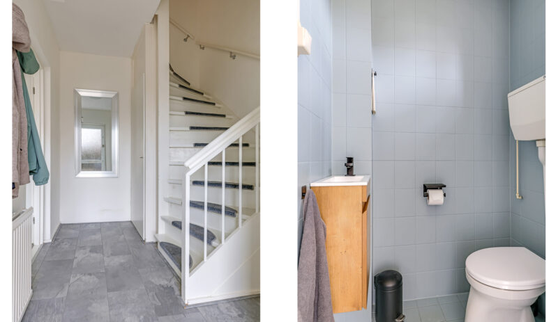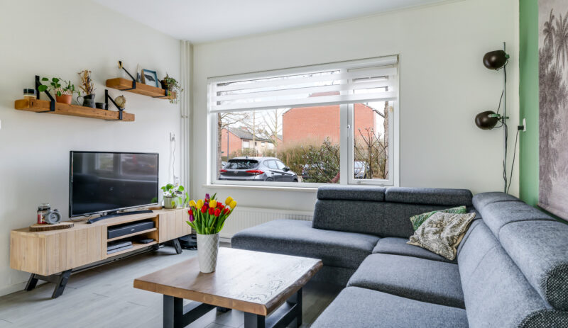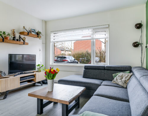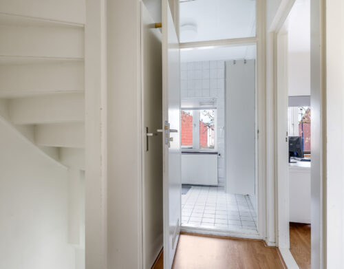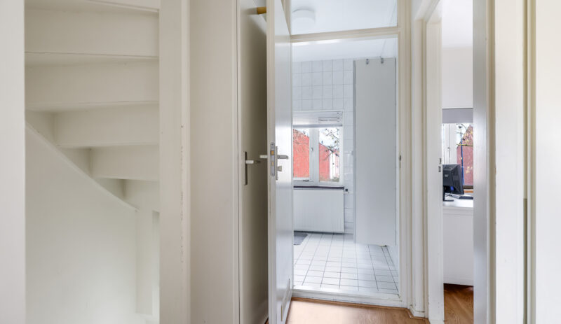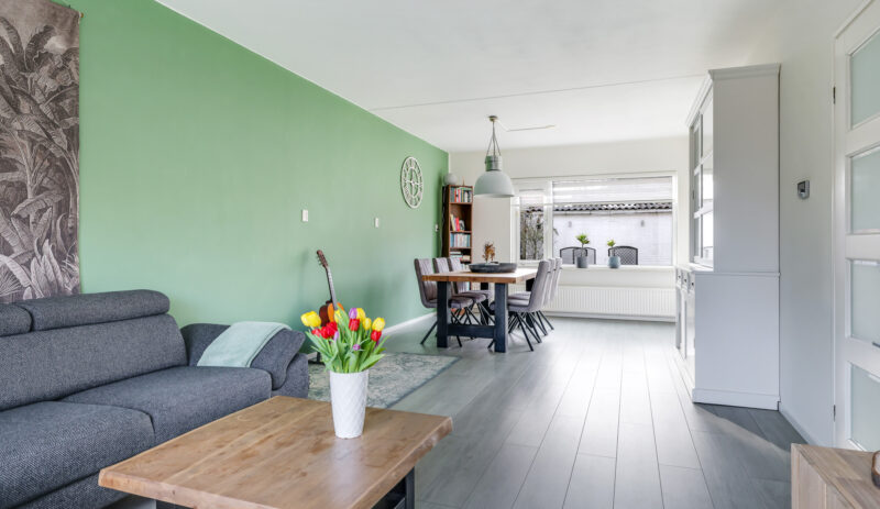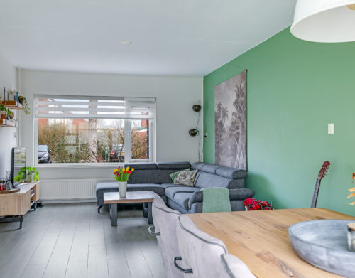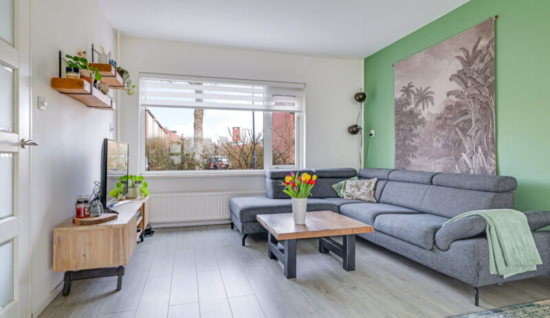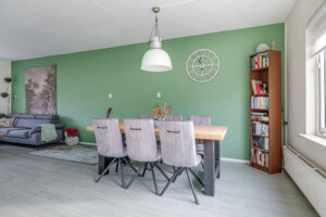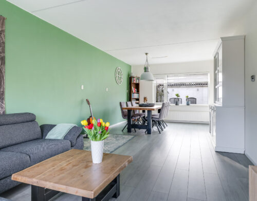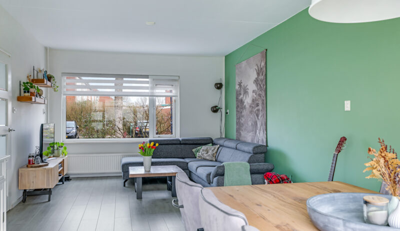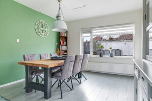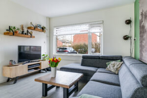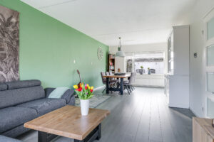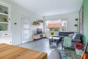 Bij binnenkomst komt u in de ruime entree met toilet en fonteintje, meterkast en een praktische provisiekast onder de trap. Vanuit de hal heeft u toegang tot de lichte en zonnige woonkamer met eethoek. De grote raampartijen zorgen voor veel daglicht en geven de ruimte een open en aangename sfeer. De woonkamer is afgewerkt met een nette laminaatvloer, wat zorgt voor een moderne en verzorgde uitstraling.