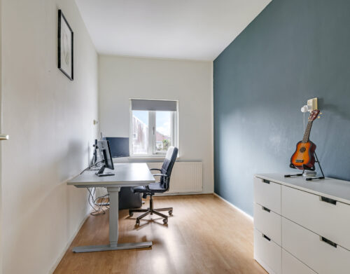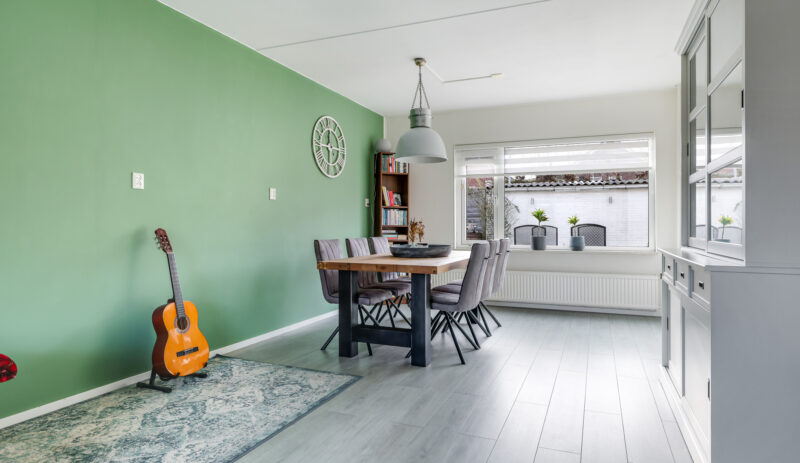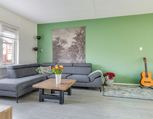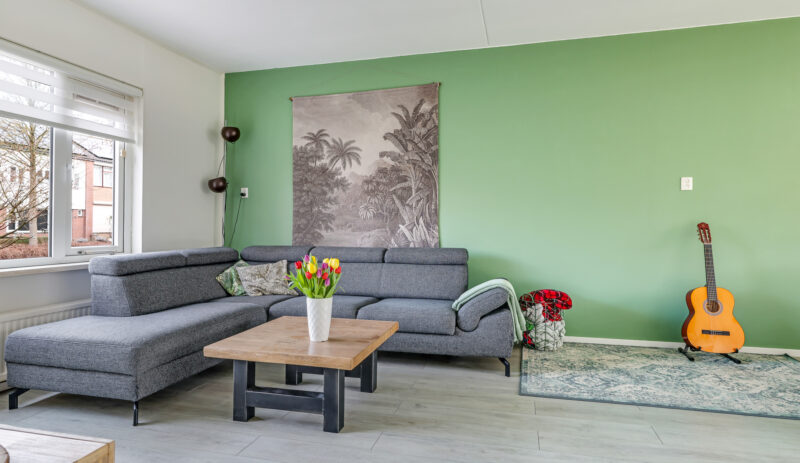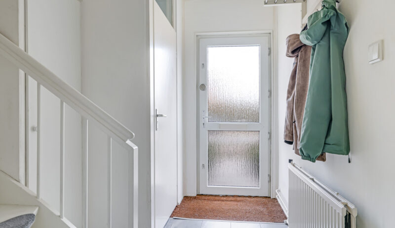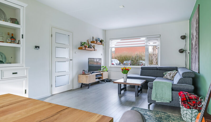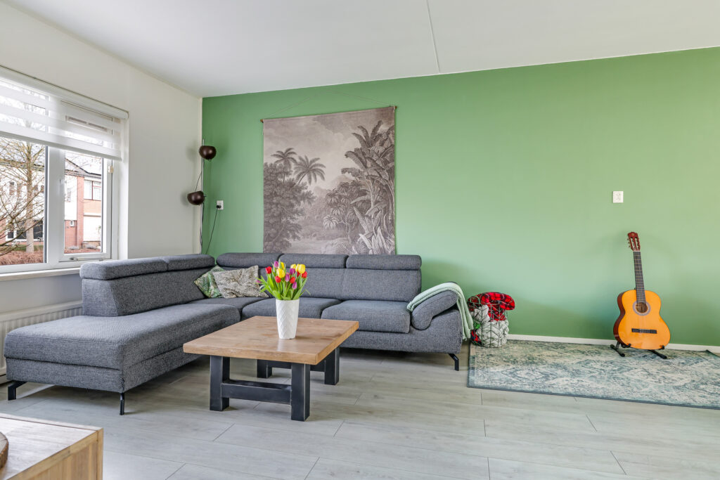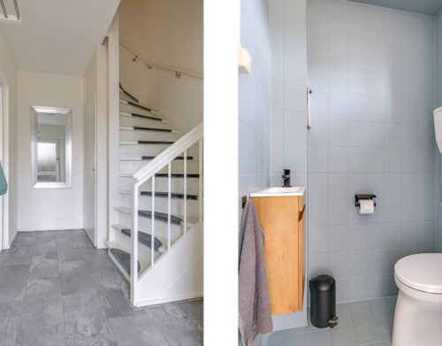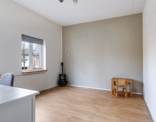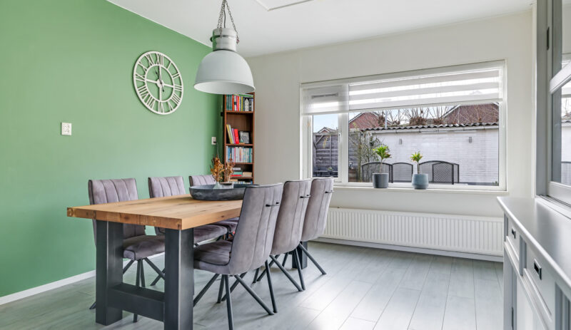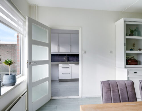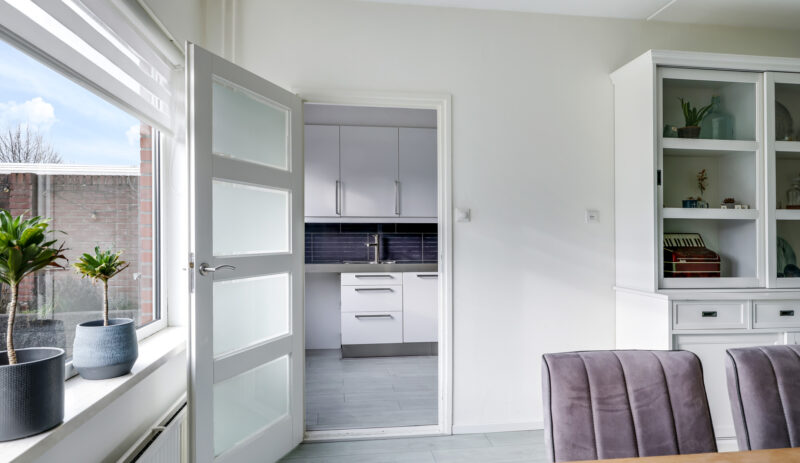 Bij binnenkomst komt u in de ruime entree met toilet en fonteintje, meterkast en een praktische provisiekast onder de trap. Vanuit de hal heeft u toegang tot de lichte en zonnige woonkamer met eethoek. De grote raampartijen zorgen voor veel daglicht en geven de ruimte een open en aangename sfeer. De woonkamer is afgewerkt met een nette laminaatvloer, wat zorgt voor een moderne en verzorgde uitstraling.