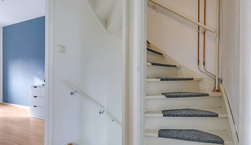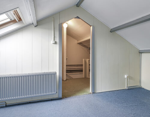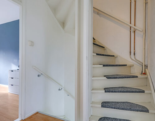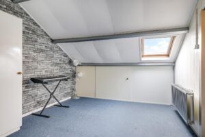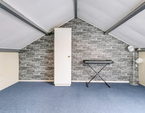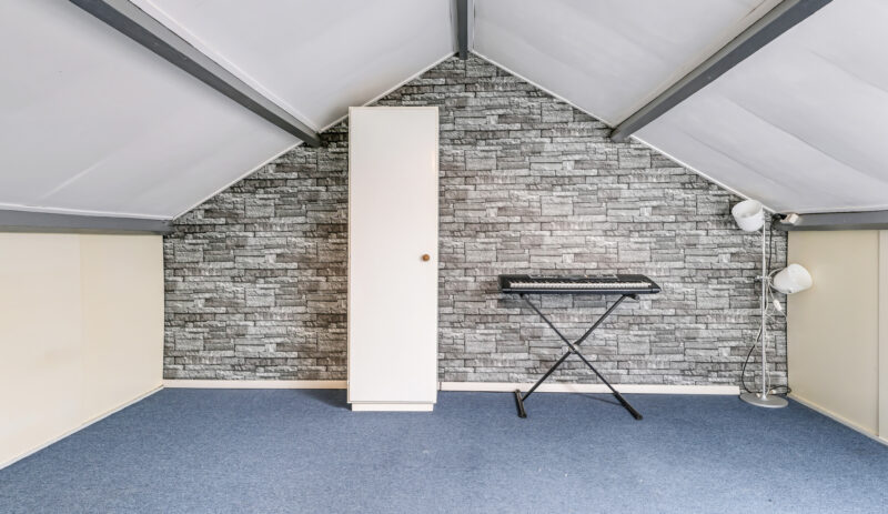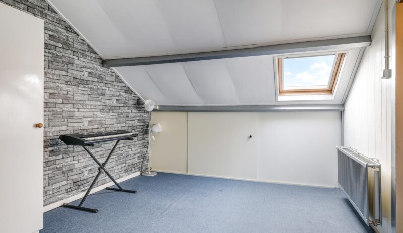 Een vaste trap brengt u naar de royale zolderverdieping. Deze multifunctionele ruimte biedt volop mogelijkheden voor het creëren van een vierde slaapkamer, een werkruimte of een hobbykamer. Op de voorzolder bevinden zich de aansluitingen voor de wasmachine en droger, evenals de cv-ketel. Achter de knieschotten is extra bergruimte aanwezig, ideaal voor het opbergen van seizoensspullen.